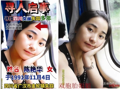 雙胞胎姐姐發布自己的照片尋找妹妹陳艷華
