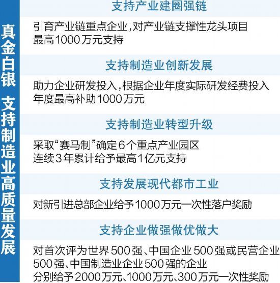 記者了解到,該政策從支持產業建圈強鏈、支持制造業創新發展、支持制造業轉型升級、支持發展現代都市工業、支持企業做強做優做大、加強產業空間保障、加強資源要素支撐7方面打出一套“組合拳”,最高給予1億元獎勵。