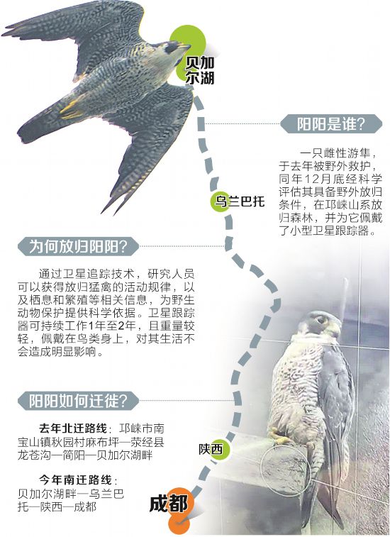 時隔近一年,跋涉兩千多公裡,蓉城再相遇。今年9月,陽陽開始了受到救助后的第一次南遷。9月26日,隨著高緯度地區氣溫降低,研究人員發現,陽陽向南飛越了貝加爾湖,推測它准備南遷﹔9月29日,研究人員確認陽陽已開始南遷,正式踏上歸途﹔10月13日,衛星追蹤器傳回的數據顯示,陽陽已回到簡陽。像之前一樣,它喜歡停歇於高層建筑頂部。研究人員還在高樓間發現了被它獵殺並帶回的黑水雞,“這充分說明,放歸后的陽陽健康狀態相當不錯。”