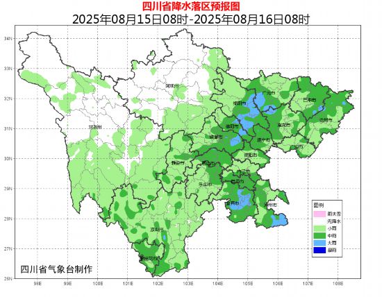 根據四川省氣象台發布的最新天氣預報:15日至17日,盆地以陰間多雲天氣為主,大部地方有雷雨或陣雨,其中15日至16日部分地方有中雨,局部大雨﹔川西高原北部以多雲間晴天氣為主,川西高原南部和攀西地區多雷雨或陣雨,局部地方有中到大雨。