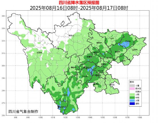 16日白天到晚上,盆地大部陰天間多雲有雷雨或陣雨,雨量小到中雨,其中巴中、眉山、樂山3市局部地方有大雨﹔川西高原北部多雲間晴有分散陣雨,川西高原其余地方和攀西地區多雲間陰有雷雨或陣雨,其中甘孜州南部和攀西地區有中雨,個別大雨。