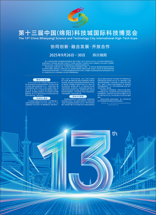 第十三屆中國(綿陽)科技城國際科技博覽會(簡稱“科博會”)將於2025年9月26日—30日在四川省綿陽市舉行。本屆科博會以“協同創新·融合發展·開放合作”為主題,由中國生產力促進中心協會、中國國防工業企業協會、中國國際科學技術合作協會、中國科技評估與成果管理研究會4家國家級協會聯合主辦。