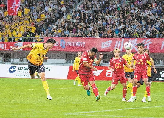 成都錦城隊攻得犀利,廣安板楯蠻隊守得精彩。直到第89分鐘,成都錦城隊才在一次角球中由替補上場的杜金洋頭球破門,將比分鎖定為3:0,如願取得四連勝。(成都日報錦觀新聞記者 胡銳凱 攝影 李冬)