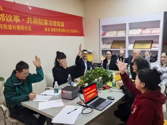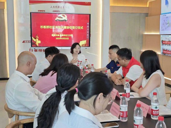 上午10點,杉板橋社區黨群服務中心一樓創客中心內,社區黨委正與轄區共建單位續簽共駐共建協議,共同商定資源共享、難題共解和活動互聯等具體方案﹔隔壁議事空間裡,5名黨員骨干和微網格員圍坐桌前,逐條梳理著居民群眾訴求。