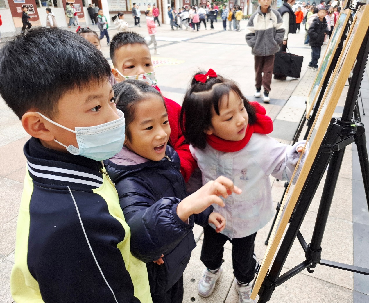 “哇,這些畫真美呀!”“這線條也太真實了!”11月21日,在溫江區東大街第一小學的優秀作品巡展現場,傳來孩子們陣陣贊嘆之聲,一幅幅生動的繪畫作品吸引了眾多師生駐足觀看。觀展的學生們從畫作中獲取靈感,提升了繪畫的興趣,也在欣賞之余,意識到保護自然環境的重要性。來自三年級學生劉同學深有感觸地說:“這些畫真美,尤其是那幅《金溫江》,畫出了溫江河湖的美。”