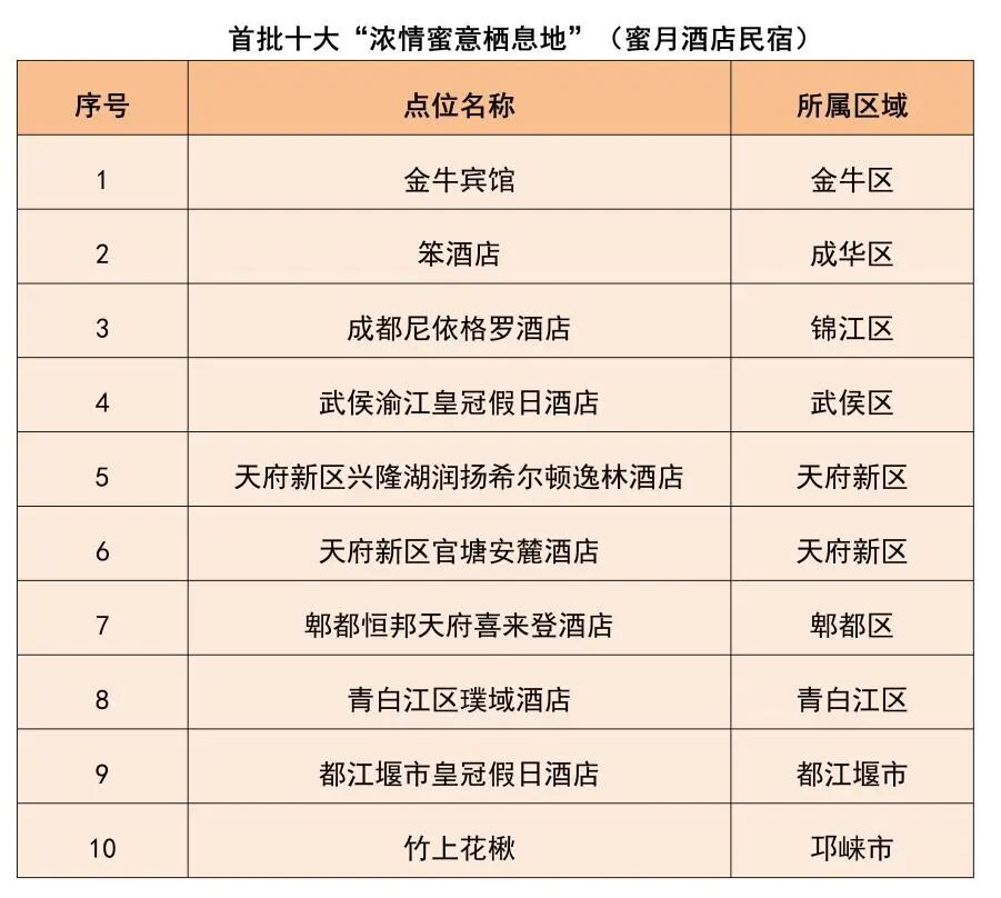 成都的浪漫從不止一處驚喜!八個“十大”甜蜜榜單來襲,涵蓋浪漫婚戀街區、愛情地標、婚紗旅拍地、婚姻登記處、婚旅線路、蜜月住宿、婚慶酒店和非遺信物,從街角邂逅到山海盟誓,從領証儀式到蜜月休憩,承包你愛情裡的每一個重要時刻∼