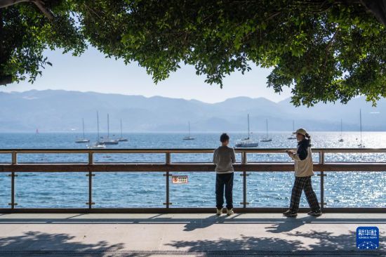 1月27日,游客在雲南省玉溪市撫仙湖畔游玩。