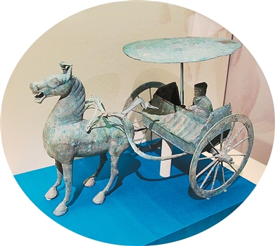 甘肅武威雷台漢墓出土的東漢銅車馬,再現了墓主人生前出行時的赫赫威儀。這組儀仗陣列由39匹銅馬、1頭銅牛、14輛車、17個武士俑和28個奴婢俑組成,其中包括著名的“馬踏飛燕”(銅奔馬)。此次展出了雷台漢墓的青銅軺車和持戟武士俑。軺車是古代一種輕便的馬車,多為貴族乘用。這件銅軺車由車、馬、傘蓋和御奴組成,與斧車一起為儀仗隊列的前導車。