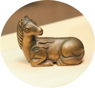 來自秦始皇帝陵博物院的鞍馬俑是此次展覽中“最古老的馬”。它出土於陝西西安秦兵馬俑二號坑,是騎兵俑的坐騎。它四蹄直立,勁健有力,兩耳如削竹,耳前有鬃花,尾巴扎成長辮。馬背上有鞍韉,鞍韉周圍綴有纓絡和短帶,鞍釘、肚帶、參扣等皆清晰可見。