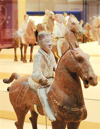 展廳中央,數十件西漢彩繪陶兵馬俑整齊列陣,氣勢威武。它們出土於陝西咸陽楊家灣漢墓,距漢高祖劉邦的長陵約4公裡。墓中出土的兵馬俑分大小兩種,大騎馬俑的馬有黑、紅、紫三色,馬身彩繪馬韉和轡頭等,騎士身著紅、白、綠、紫等服飾,有的披黑色鎧甲﹔小騎馬俑體格更輕巧。馬姿態生動,或靜立,或昂頭嘶鳴。騎士一手呈持兵器狀,一手作勒缰狀。許文珺說,漢兵馬俑軍陣中出現大量騎馬俑,反映西漢初年騎兵已具有一定規模。