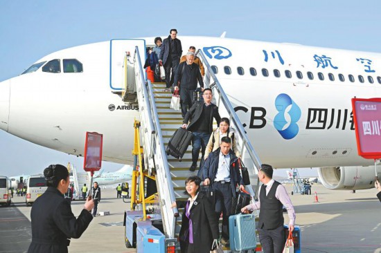 三月三日,出席全國政協十四屆四次會議的四川省全國政協委員乘機抵達北京。四川日報全媒體記者楊樹攝