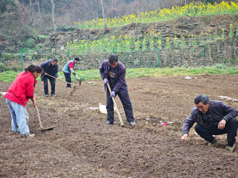 “這蓋土的活兒最是精細,土厚了悶芽,土薄了保不住墒,就得這樣一點點捋勻了才放心。”村民們屈膝蹲在李子樹間距的土地旁,用手捧起細碎的土壤,輕柔地鋪撒在剛播撒的種子表面。