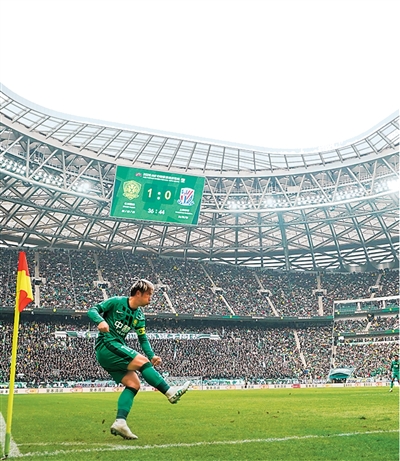 北京國安隊球員張稀哲在比賽中發角球。 |