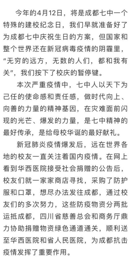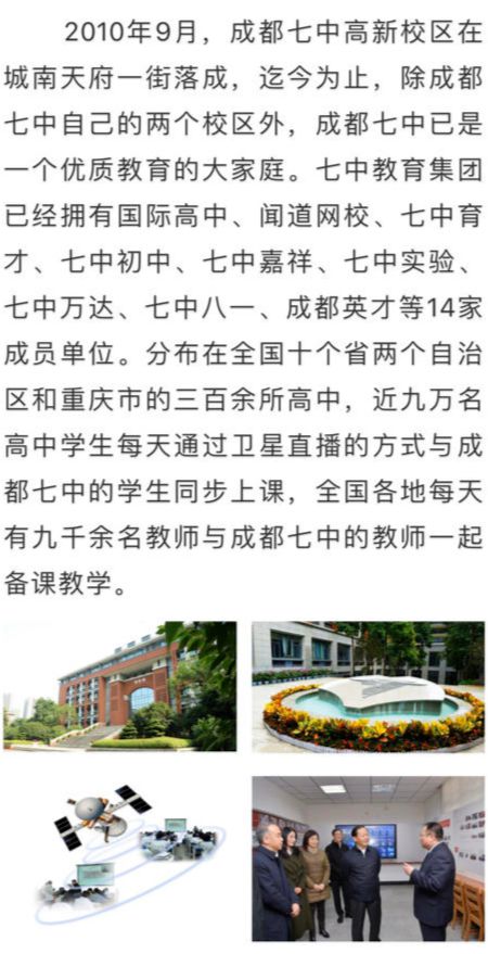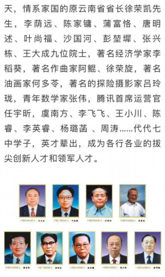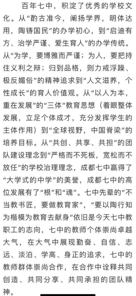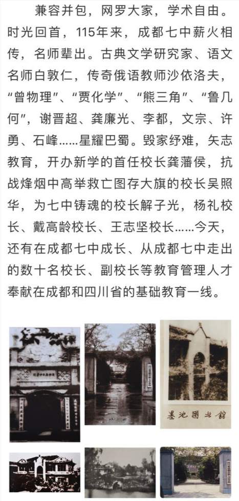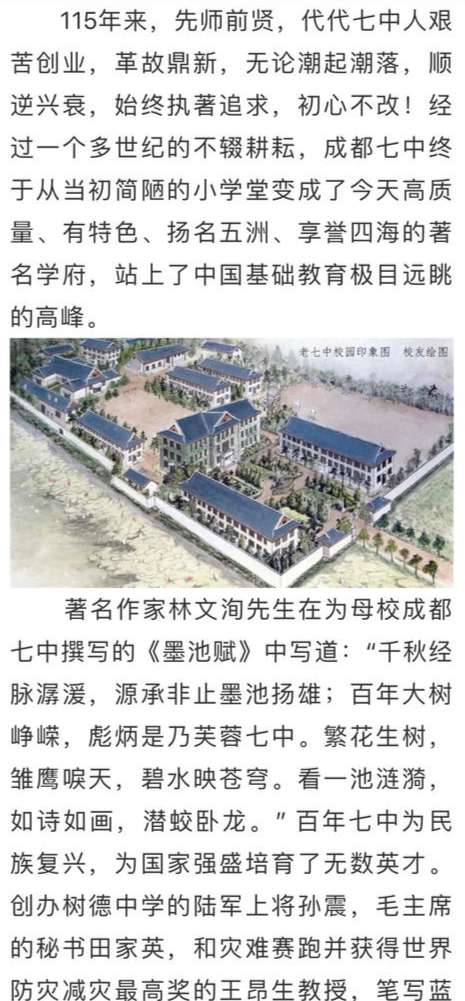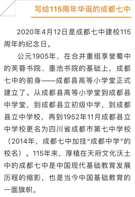 2020年4月12日,成都七中迎来115岁的生日,从1905年4月12日建校以来,成都七中为各行各业培养了拔尖创新和领军人才,经过一代又一代七中人的努力,成都七中已经成为中国现代基础教育发展历程的缩影,也是当今中国基础教育的一面旗帜。