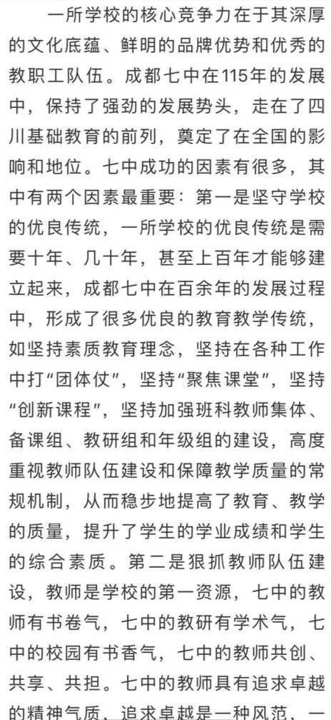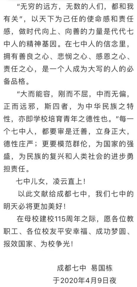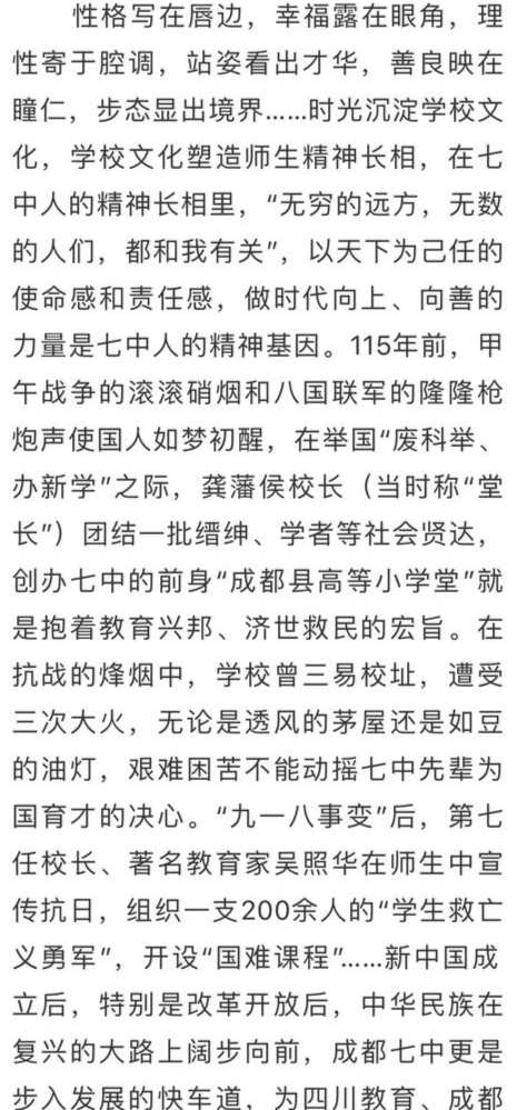 “性格写在唇边,幸福露在眼角,理性寄于腔调,站姿看出才华,善良映在瞳仁,步态显出境界…… ”成都七中校长易国栋在写给成都七中115周年华诞中,他希望七中人以天下为己任的使命感和责任感,做时代向上、向善的力量,“无穷的远方,无数的人们,都和我有关”。