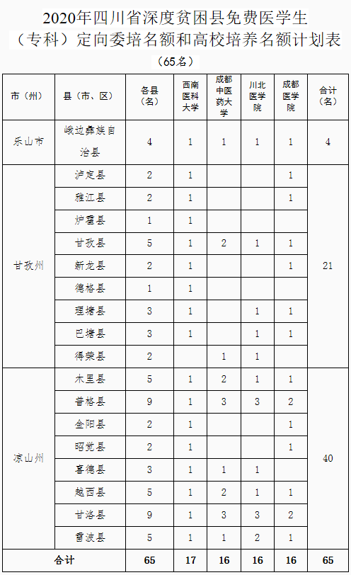 人民网成都5月8日电 近日,四川省卫生健康委员会、四川省高等教育招生考试委员会、四川省教育厅、中共四川省委机构编制委员会办公室、四川省人力资源和社会保障厅联合印发了《2020年四川省深度贫困县免费医学生(专科)定向培养项目实施方案》(以下简称《方案》)。《方案》明确2020年定向委培免费医学生(专科)65人,其中乐山市4人、甘孜州21人、凉山州40人。