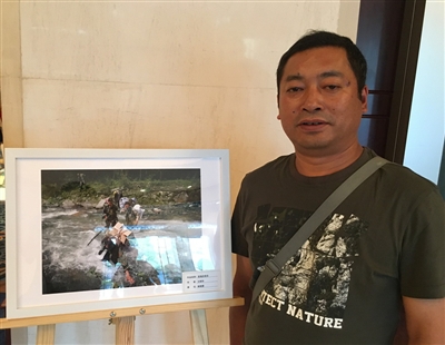 王明华和他拍摄的巡护员穿越河流的照片“坚强的信念”