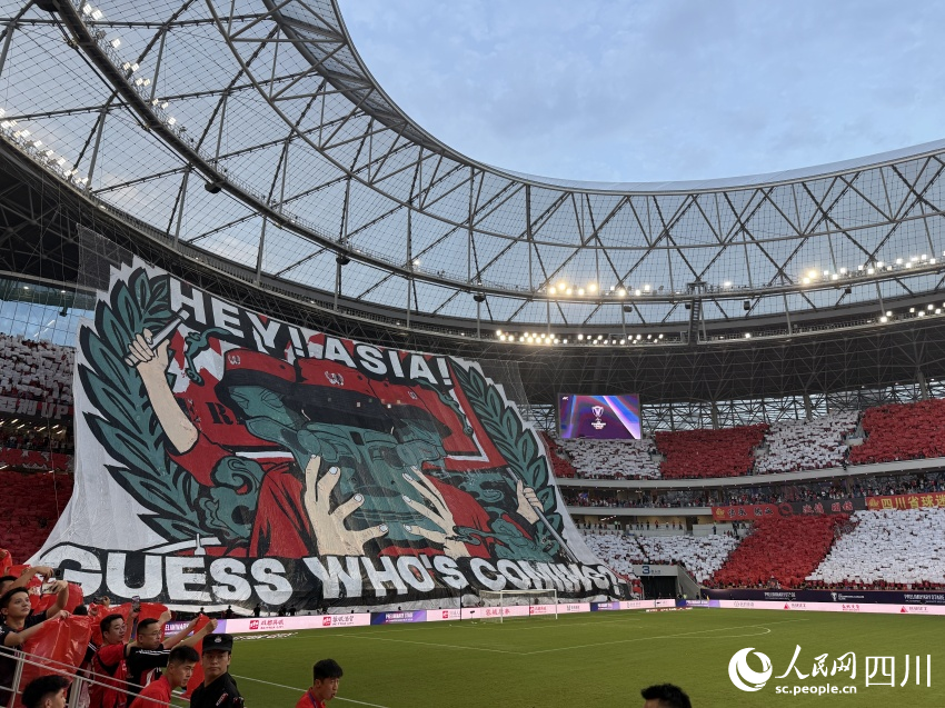 除了比赛本身,成都蓉城的主场还有一个非常大的惊喜。当日19时29分球员入场仪式时,全场41713名球迷举起了事先准备的各色拼图。在北看台,一面以三星堆为主题的巨大Tifo(意思是大型横幅、拼图)徐徐展开,用英文写着“嗨!亚洲!猜猜谁来了”。与此同时,球场东看台和南看台则分别打出蓉城队徽和“跟随你的心,永不停歇”英文字样,画布上还呈现了成都蓉城走上亚冠赛场过程中的几个关键时刻。当巨型Tifo在看台上翻滚流动,不少球迷热泪盈眶。