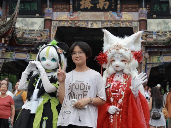 值得一提的是,泠染工作室在举办“二次元兽头展示”的同时,还特别策划了二次元人物秀,在灌县古城内热门点位巡游,引来大量游客驻足观赏或拍照合影。