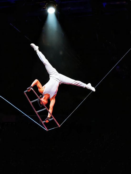 在时长6分30秒的表演中,廖杰将技术与艺术完美融合。他脚下的钢丝仅8毫米粗细,却要在这根“生命之线”上完成后滚翻倒立、梯上造型、倒立手摇独轮车等一系列高难度动作,每一个动作都需要精准控制身体平衡,稍有偏差便可能面临危险。更令人惊叹的是,表演过程中钢丝还会呈现近45度的晃动,廖杰需在动态平衡中来回走动,借助身体的细微调整化解晃动带来的挑战,为现场观众带来极具冲击力的视觉体验,也让评委们对中国杂技演员的专业素养赞不绝口。