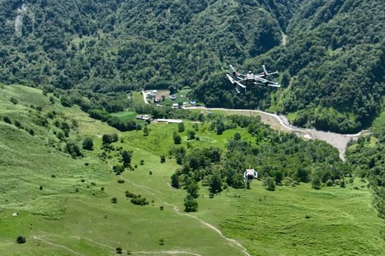 记者看到,这个约27千克的雨量站设备,通过载重无人机的绳子牵引,从山脚“起飞”。与之匹配的,还有一只勘探无人机“开路”,确保其投放地区符合监测条件后,最终投放至高山无人区草坪处。落地后,雨量站要在山区“站稳脚跟”,它的三条支架根据不同地形自动调整,以适应地形,确保雨量站在水平位置,确保准确测量。