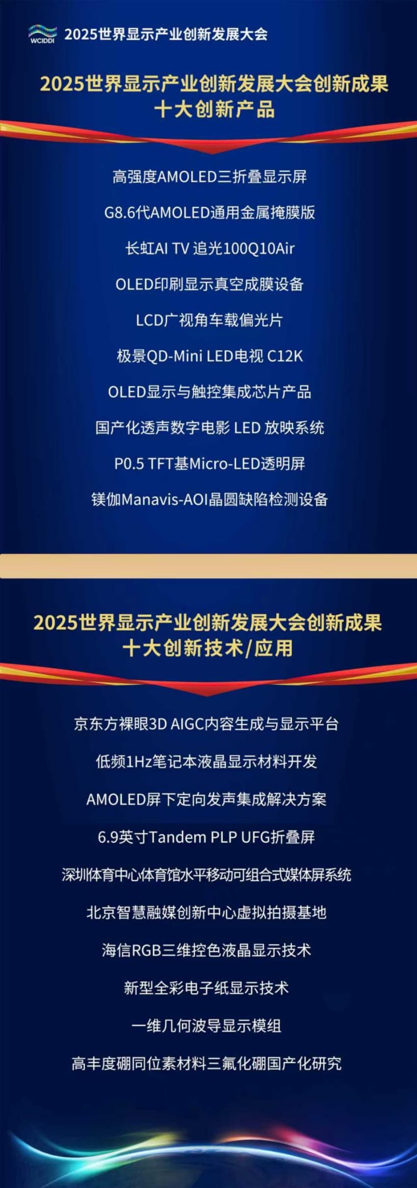 据介绍,为树立行业标杆、共享创新成果、营造良好产业生态,经国际信息显示学会、中国电子视像行业协会、中国电子材料行业协会、中国光学光电子行业协会发光二极管显示应用分会、中国计算机行业协会虚拟现实产业专业委员会、中国OLED产业联盟、世界超高清视频产业联盟、成都新型显示行业协会、南京平板显示行业协会等国内外重点行业机构和单位推荐,大会综合技术领先性、市场竞争性、功能适用性、创新独特性,推选出十大创新产品、十大创新技术(应用)为“2025世界显示产业创新发展大会创新成果”。
